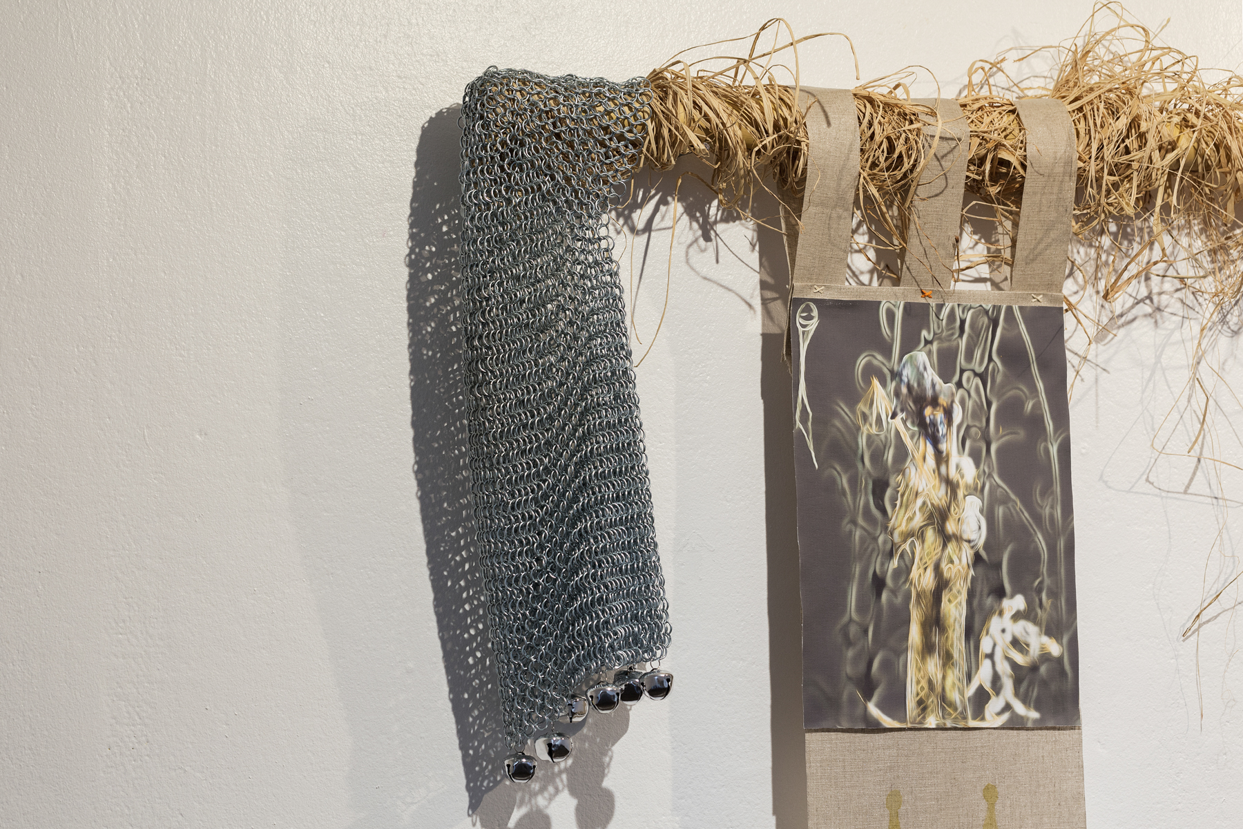 Ignis Fatuus, 2021. Prints on canvas, linen, watercolour, soft pastel, cotton thread, natural raffia, wooden bar, spray paint, chainmaille, jingle bells